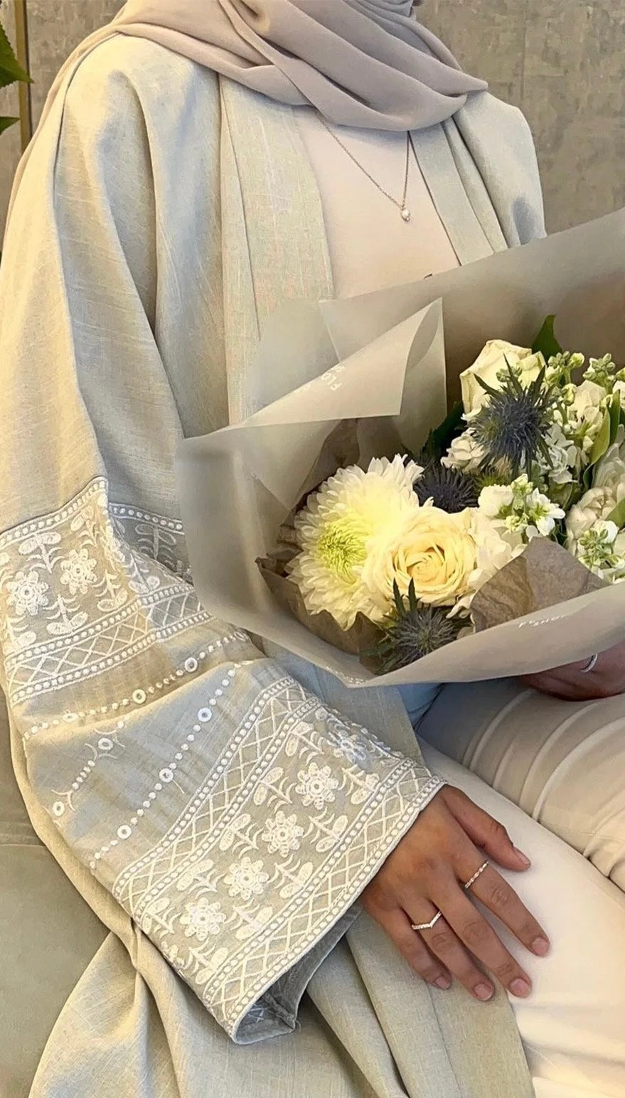 Get ready for your next formal occasion with our beautifully embroidered open abaya. Made from a luxurious linen blend material, this abaya exudes elegance and sophistication. Perfect for any event, this abaya is a must-have for every wardrobe. Can be worn without a belt for a more flowy, modest look or with a belt for a more structured look.
